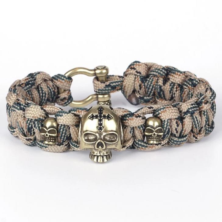 Un magnifique bracelet de survie en paracorde, orné de trois têtes de mort en acier